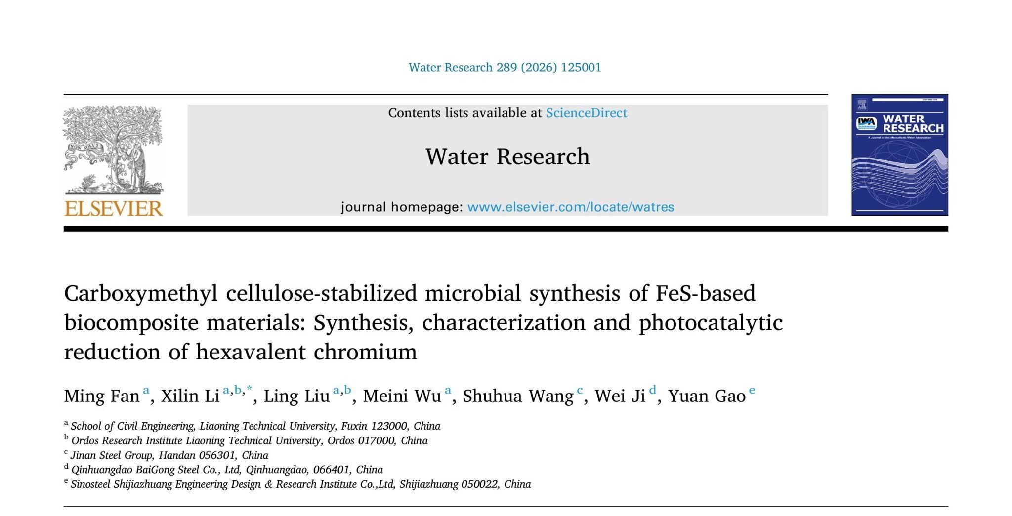 近日,金沙2004路线js5李喜林教授团队(第一作者范明博士,通讯作者李喜林教授)完成的研究成果,在水处理领域国际顶级学术期刊《Water Research》上正式发表。论文题目为《Carboxymethyl cellulose-stabilized microbial synthesis of FeS-based biocomposite materials: Synthesis, characterization and photocatalytic reduction of hexavalent chromium》。