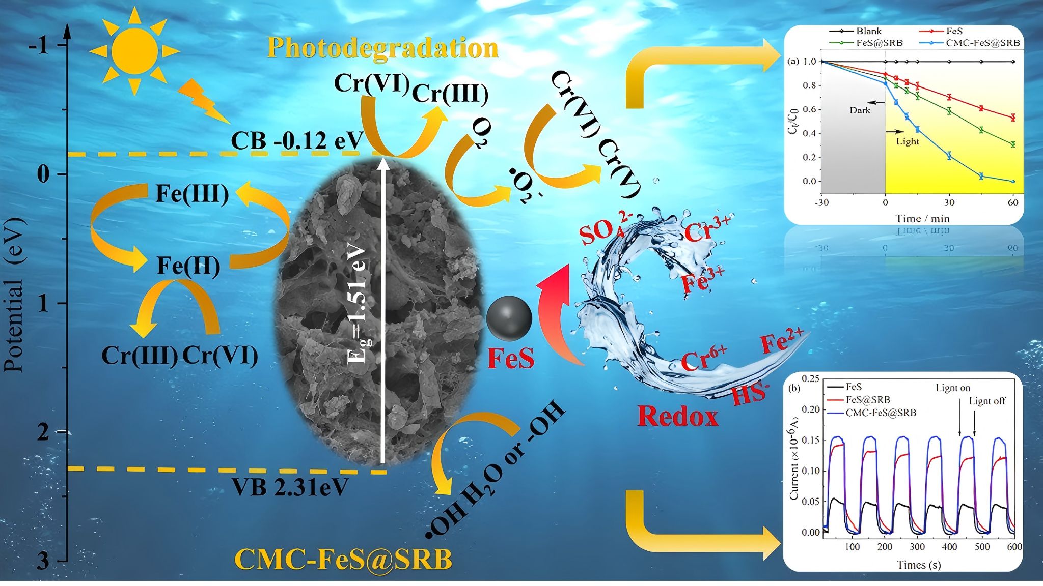李喜林教授团队长期深耕铬渣污染场地土壤-地下水系统污染问题,开展从场地调查、污染规律分析、治理修复、安全利用等系统化研究。本次论文成果是李喜林教授团队在该领域研究的最新成果。论文针对传统水处理技术难以有效去除高浓度、有毒重金属铬污染的技术瓶颈,利用羧甲基纤维素钠(CMC)对硫酸盐还原菌(SRB)生物矿化合成的FeS进行改性,构建出一种绿色环保的CMC-FeS@SRB生物复合光催化剂,将其应用于水体中Cr(VI)的光催化降解。通过系统的实验设计、机理分析与工程应用验证,揭示了“半导体光催化-微生物辅助-芬顿协同”作用机制,并首次系统地阐明了该材料在光催化去除Cr(VI)过程中的反应机理。研究成果为高浓度Cr(VI)污染水体的治理提供了创新的技术路径和理论支撑,进一步推动了绿色水处理技术的发展。